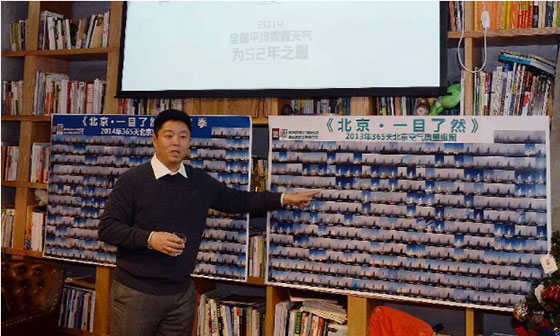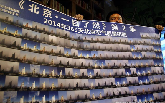 ??????? 這是鄒毅拍攝和拼版的2014年“一目了然”系列照片。鄒毅用2013、2014兩年時(shí)間,在同一地點(diǎn)、同一時(shí)刻用手機(jī)拍攝照片,記錄天氣變化狀況,并將兩年拍攝的700余張照片按年份匯總在一起,希望通過直觀的影像反映北京空氣質(zhì)量變化,讓更多的人關(guān)注霧霾、關(guān)注環(huán)境保護(hù)。本次分享會是他首次將兩年的拍攝成果一起集中展示。