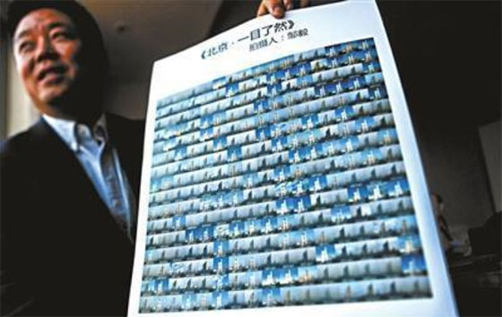 ??????? 鄒毅每天拍攝同一場景一張,組圖365張,讓大家一目了然看到北京的365天的天氣情況,呼吁公眾保護(hù)環(huán)境。這是他連續(xù)第二年以同樣方式記錄北京的天氣狀況。市民用手機(jī)拍下鄒毅的《北京·一目了然》第2季。