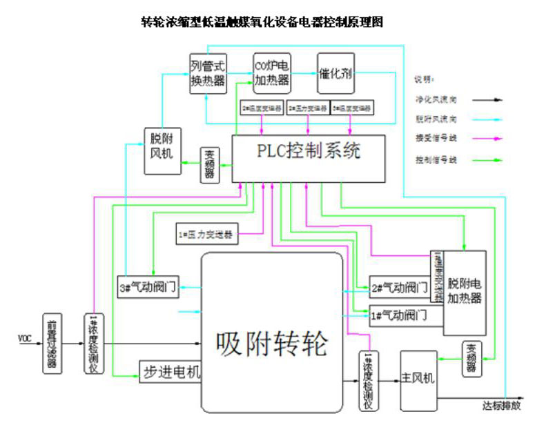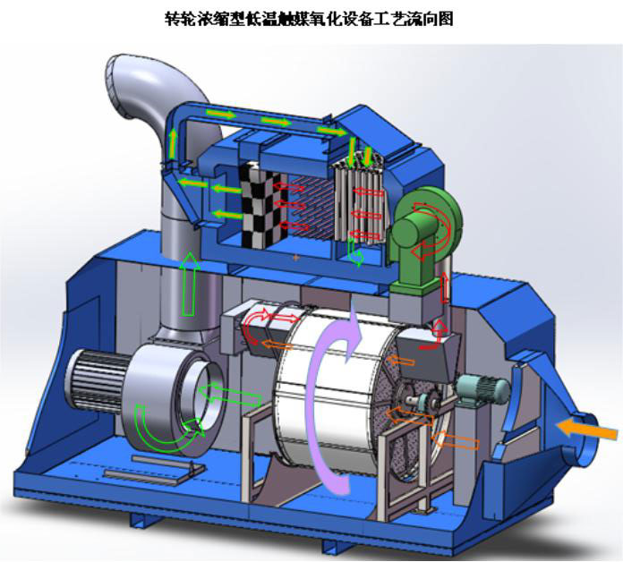 轉(zhuǎn)輪濃縮型低溫觸媒氧化設(shè)備:是采用轉(zhuǎn)輪式吸附床對有機廢氣進行吸附濃縮,濃縮的有機廢氣在脫附再生區(qū)被脫附后,被再生風(fēng)機引入催化燃燒凈化裝置,進一步凈化處理。整個裝置分為VOC濃縮區(qū)和濃縮后VOC凈化處理區(qū)兩大模塊。