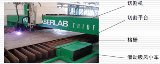 在切割平臺一側(cè)安裝方形吸風(fēng)道,吸風(fēng)道上方裝有一個可隨切割機一起移動的吸風(fēng)小車,并在切割平臺的另一側(cè)裝有吹風(fēng)風(fēng)機?;瑒游L(fēng)小車切割頭吹風(fēng)風(fēng)機安裝在切割機沿衡量方向的同一直線上。利用切割平臺上的格柵板與切割鋼板形成“煙氣通道”。切割鋼板時,吹風(fēng)風(fēng)機將產(chǎn)生的切割煙塵通過“煙氣通道”吹向吸風(fēng)小車吸風(fēng)口,進(jìn)入方形吸氣風(fēng)道,最后進(jìn)入凈化器主機進(jìn)行切割煙塵凈化處理。