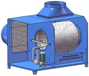 含固體物質(zhì)的空氣從圖中進(jìn)風(fēng)口流進(jìn)過濾裝置,所有的氣體沿旋轉(zhuǎn)桶徑向流過過濾網(wǎng),然后沿旋轉(zhuǎn)桶軸向流出過濾桶,最后從圖中出風(fēng)口排出過濾設(shè)備。