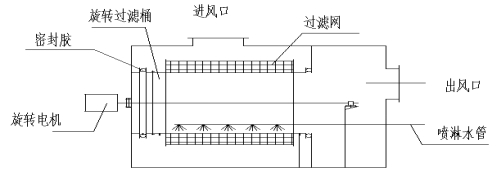 本裝置中旋轉(zhuǎn)式、帶自動清洗的空氣過濾器結(jié)構(gòu)原理如下:。